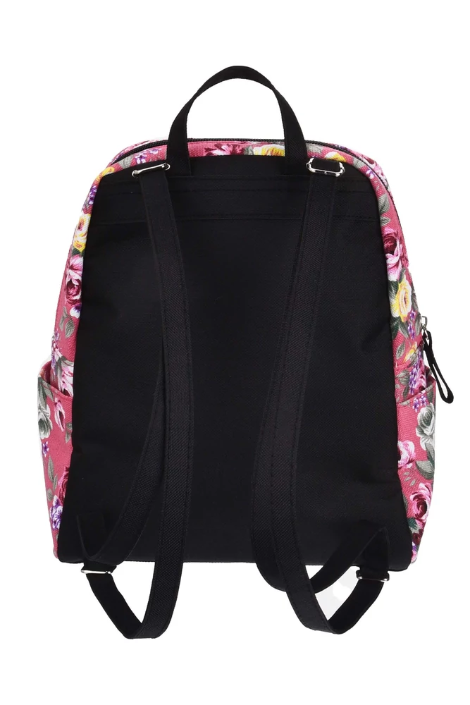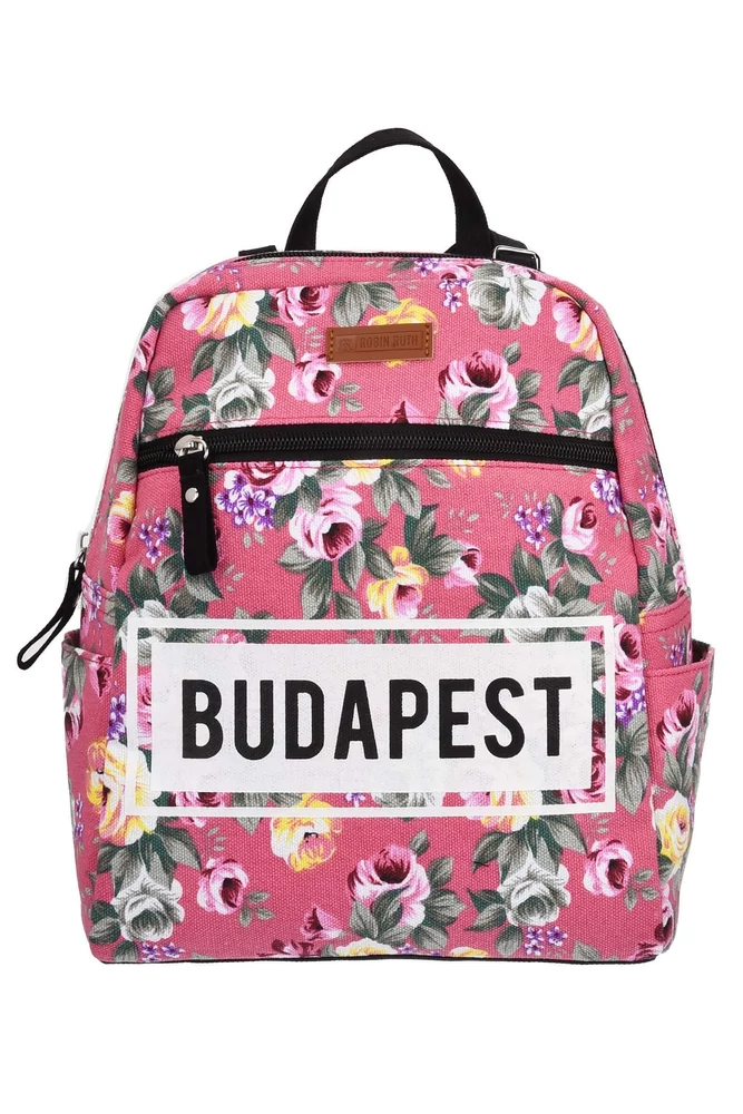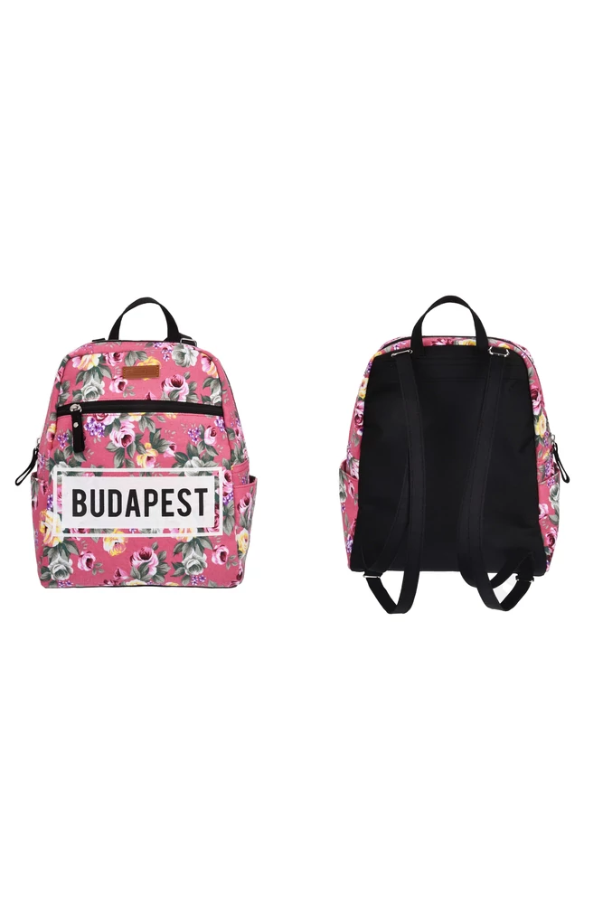 A táska, a közkedvelt virágos mintás megjelenést képviseli, ezzel teremt vidám, nyárias hangulatot. A rózsaszín alapon lévő színes virágok között, fekete színnel fővárosunk neve is látható.