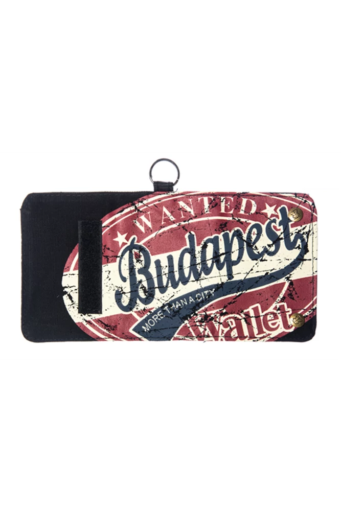 Férfi, Robin Ruth márkájú pénztárca, melyen fekete alapon, három féle színben jelenik meg a minta. A bordó, bézs és kék színek éles kontrasztja teszi feltűnővé a pénztárca kinézetét. A minta közepén található "Budapest more than a city" felirat, titokzatosságot sugall. A pénztárca több rekeszből áll, aprópénz és papírpénz tárolásához is ideális. Tépőzárral záródik.