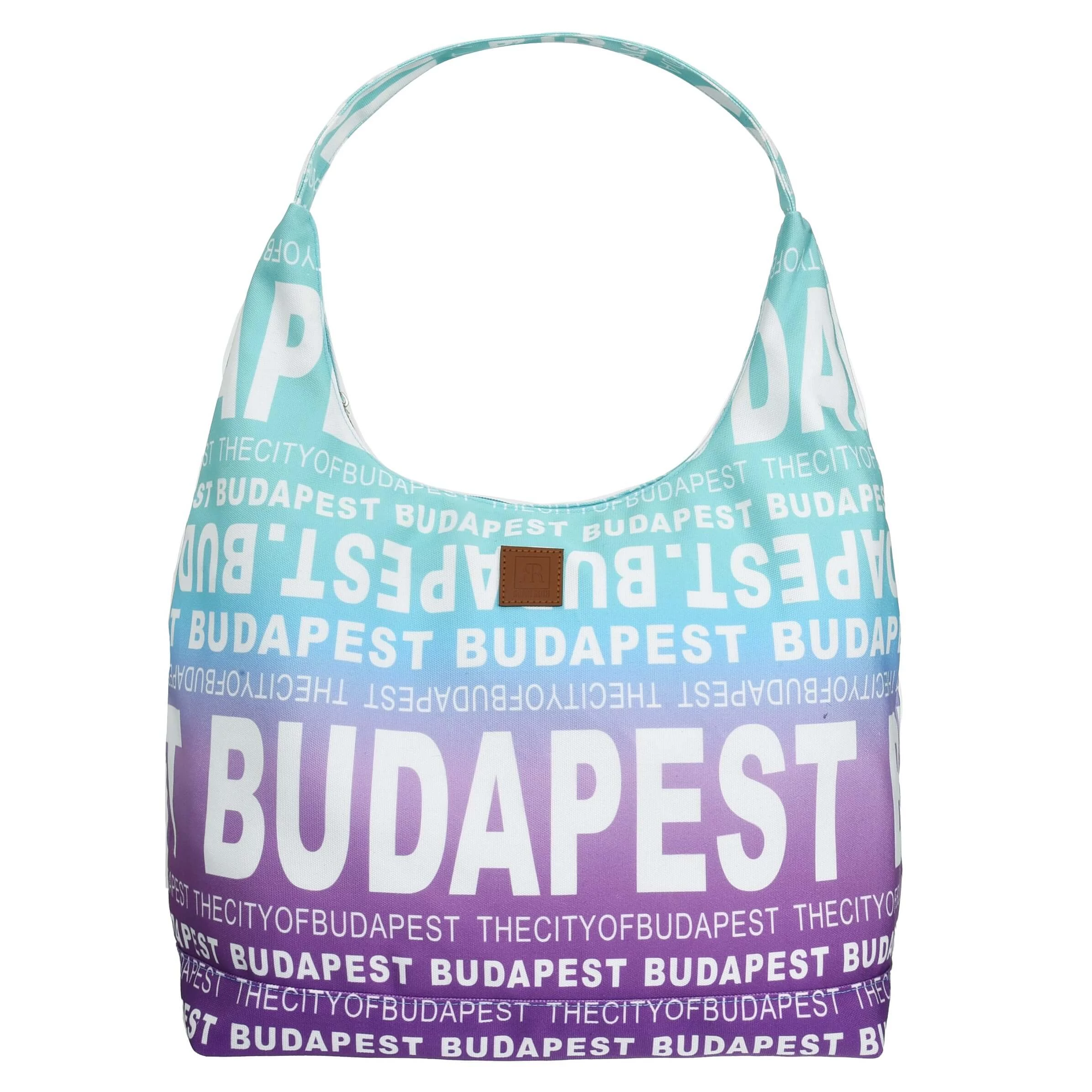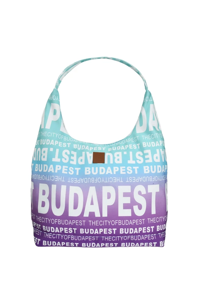 Női divattáska, melyen világoskék alapon, fehér színnel jelenik meg a "Budapest" és a "The city of Budapest" felirat. A táska közepén nagy hangsúlyt kap fővárosunk neve, ez teszi egyedivé a táska küllemét. A Budapest mintás válltáska egy vastag pánttal akasztható vállra.