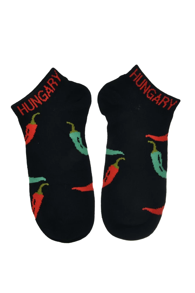 A zokni fekete alapon, piros és zöld színű paprikákkal díszített, igazán magyaros megjelenésű. A zokni szárán látható piros, "Hungary" felirat, tovább erősíti a mintához való kötődést.